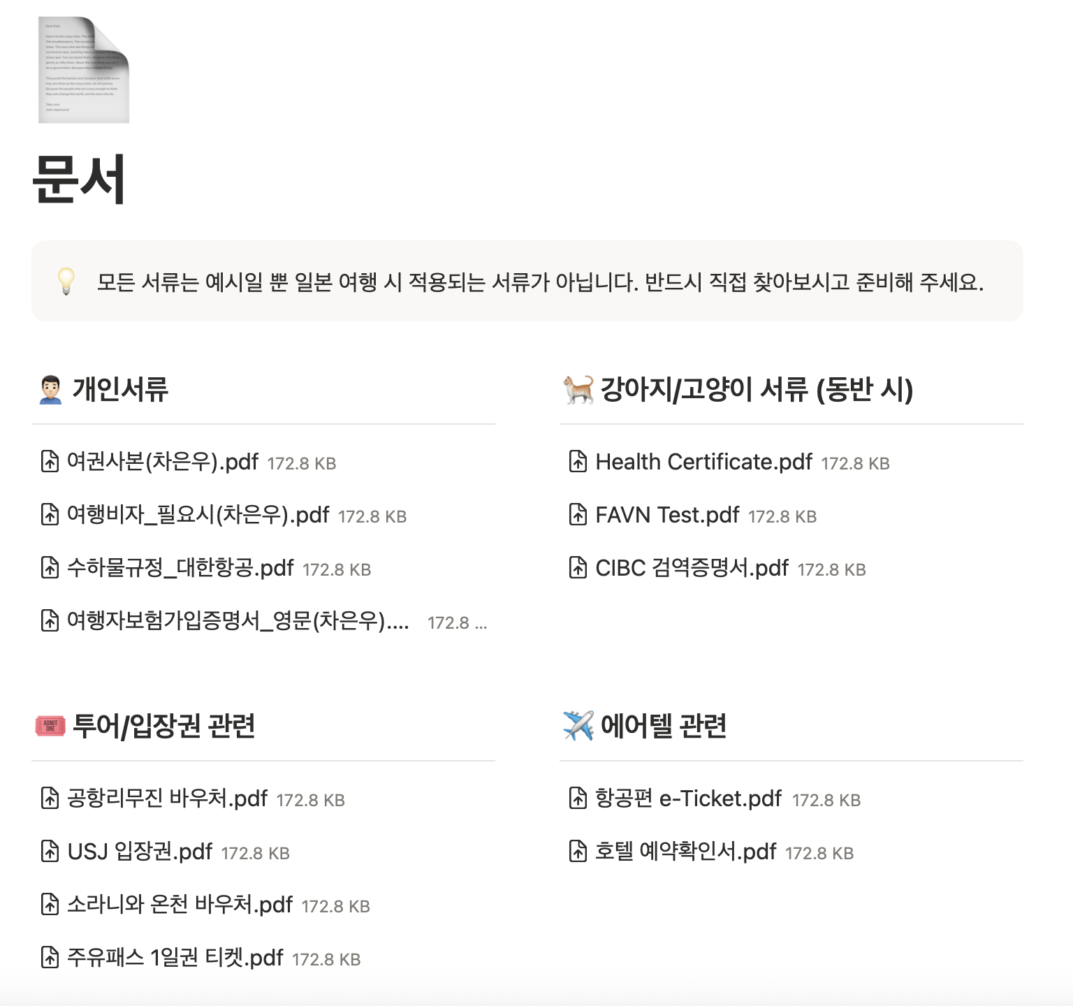이 페이지에서는 여행 중 필요할 수 있는 모든 파일을 한 곳에 모아 저장해 둘 수 있습니다. 혹시라도 발생할 수 있는 일에 대비해 여권사본, 비자가 필요한 곳에서는 비자관련 서류를, 여행지&항공사마다 다르기에 수하물 규정, 여행자보험 가입증명 서류를 개인 관련 서류로 정리하실 수 있습니다. 혹시라도 펫을 동반한 여행이시라면 펫 검역 관련 서류를 구비하셔야 할 텐데 매번 메일에서 찾을 필요 없이 손쉽게 찾아보세요. 투어 및 입장권 관련해서 바우처 저장해 두시면 메일에서 예약 내역 매번 찾으실 필요가 없습니다. :) 마지막으로는 항공, 숙박 관련 문서는 에어텔 관련에다 저장하시면 됩니다.