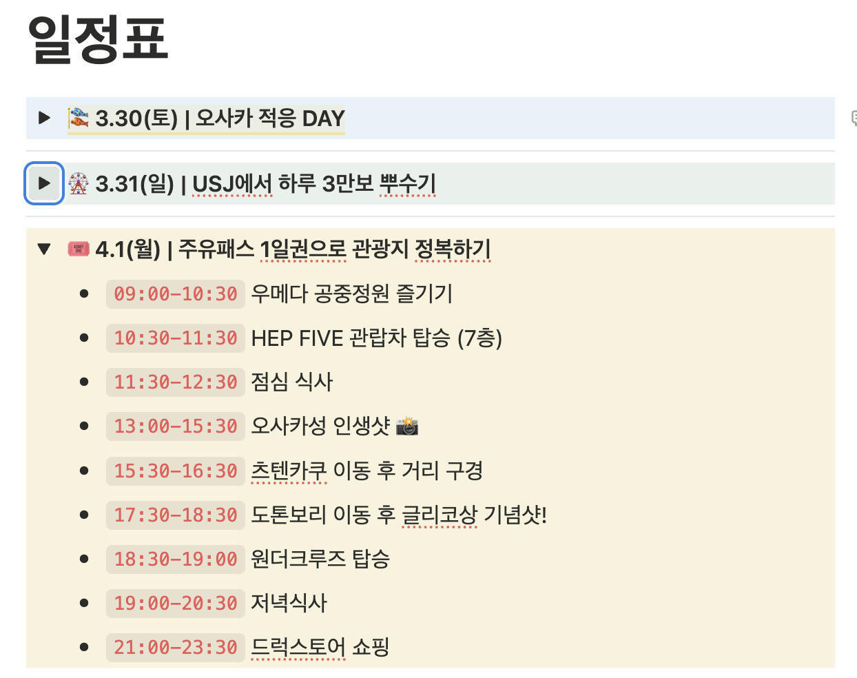 날짜별로 일정 종료 후에는 위 오른쪽 이미지처럼 토글을 닫으시면 다음날 일정을 상단에서 쉽게 확인하실 수 있어요.🙂