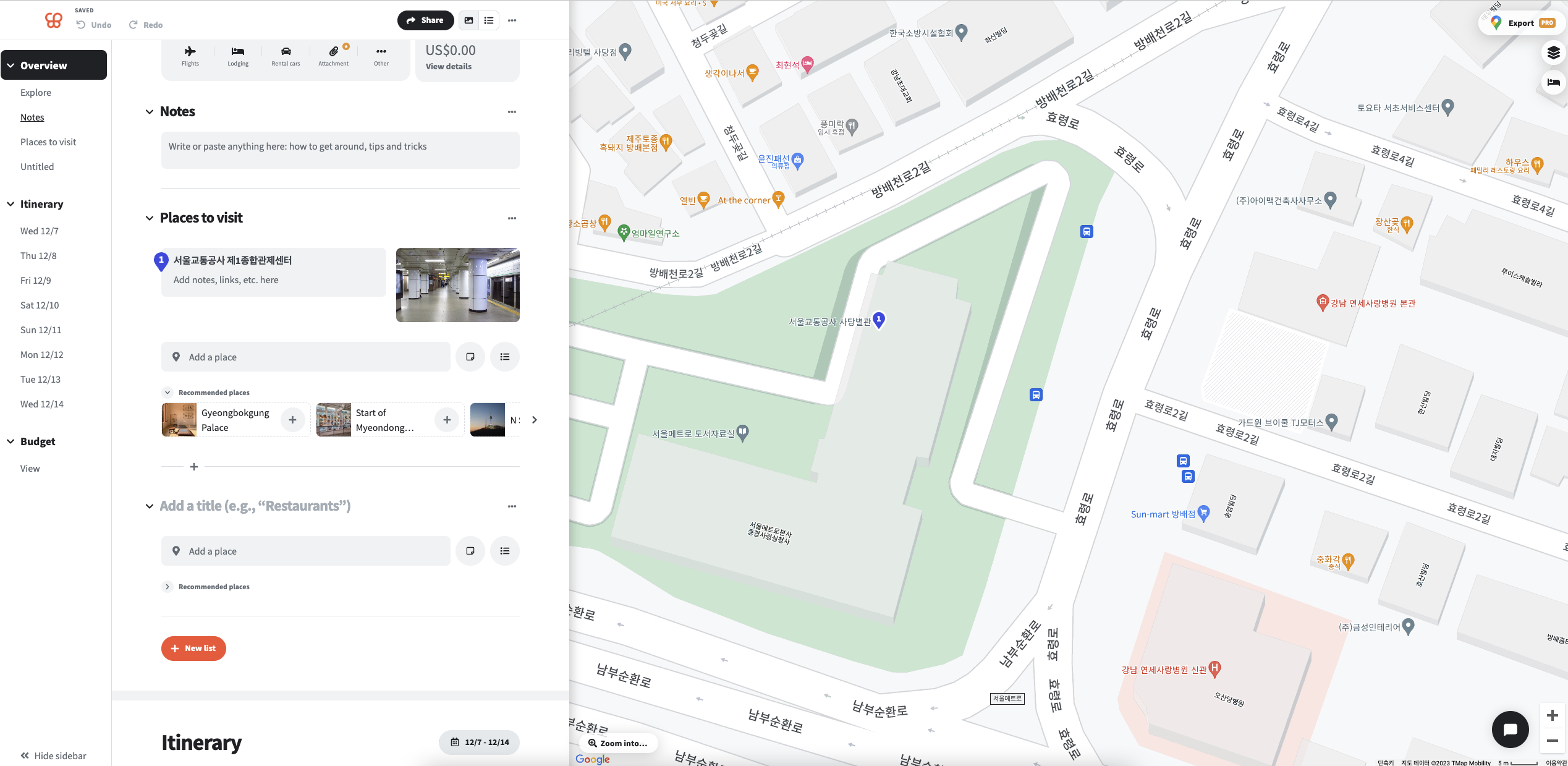 서비스의 본질을 찾아 (개발하기도 귀찮기 때문에) 최소한의 기능으로 여행 계획을 빠르게 세울 수 있는 서비스를 만들고자 하였습니다.