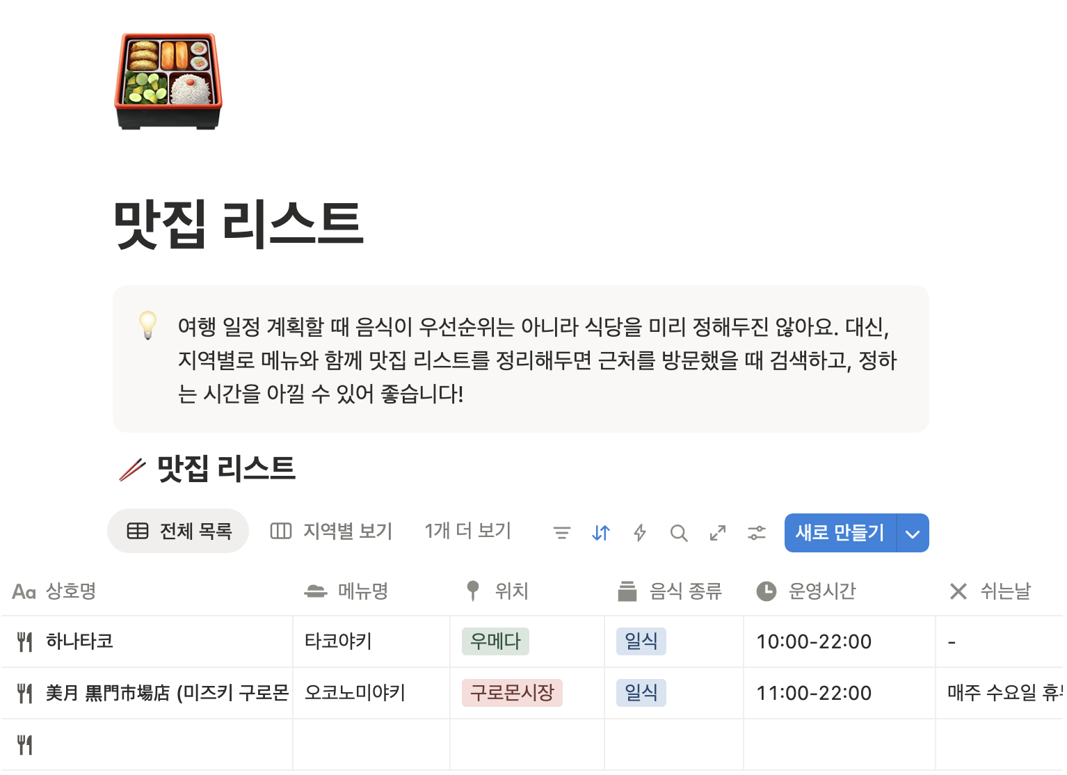 제가 페이지 내에도 적어두었지만 저는 여행에서 음식이 우선순위가 아니라서 일정을 계획할 때 식당을 예약하거나 정해두지 않는 편입니다. 그러나 여행지 가서 막상 주변 식당을 찾으려면 인터넷이 많이 느리거나 어디 애매하게 서서 식당을 찾기에 시간도 매우 아까울 때가 있더라구요. 심할 때는 여행동안 식당만 1~2시간 찾기도 해서 미리 리스트업 해놓은 식당 중 메뉴와 위치만 참고해서 고르면 시간을 아낄 수 있어요!