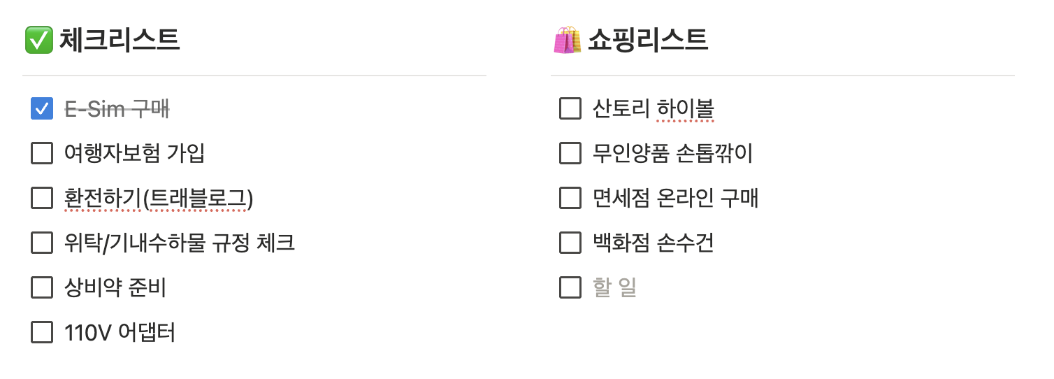 스크롤을 내리시면 체크리스트/쇼핑리스트 체크박스 리스트가 있습니다. 여행 시 꼭 확인하고 챙겨야 하는 사항들을 메모해 두시면 잊지 않고 챙기실 수 있어요. 이 부분을 자세히 정리하시는 분들도 계시지만 저는 매번 챙기는 옷, 화장품 등은 추가로 메모하지 않고 여행지 별로 꼭 잊지 않고 챙겨야 하는 부분들 위주로 메모해 두고 있어요. 쇼핑리스트는 여행지에서 기념품이나 선물 등 꼭 사게 되더라구요. 사고 싶은 물건들 정리해 두면 잊지 않고 구매할 수 있어 저는 잘 사용하고 있는 부분이랍니다.