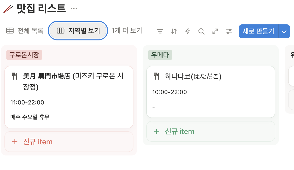 맛집 리스트 바로 밑에는 필터가 있는데요. 지역별 보기를 누르면 위치별로 딱! 만약 우메다에 있다면 필터링 된 음식점 정보만 볼 수 있어서 더 빠르게 고르실 수 있어요. 휴무일과 운영시간 정보도 한눈에 파악되기 때문에 너무 잘 사용하고 있답니다!