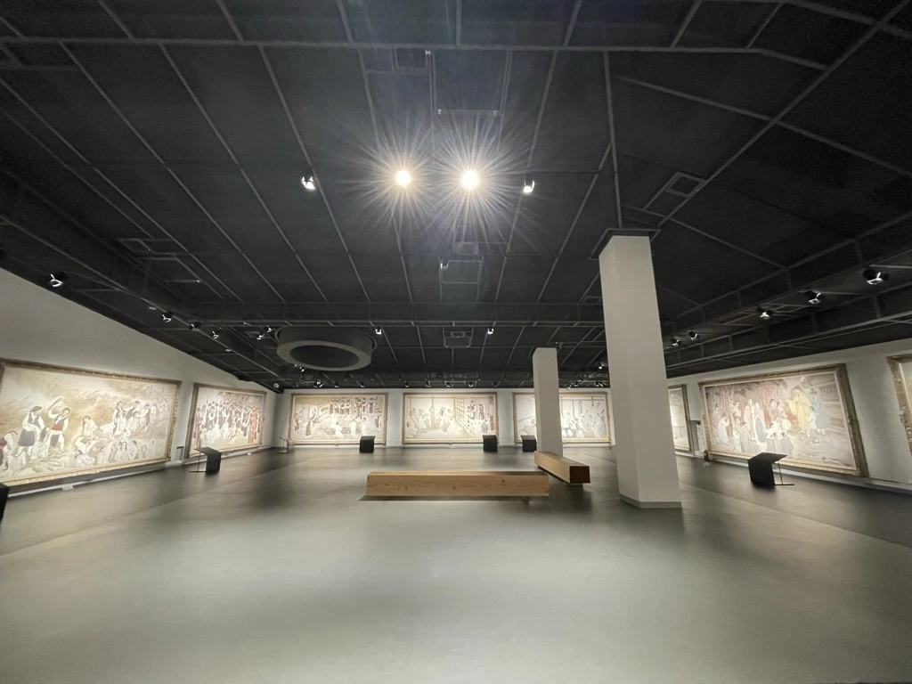 미술관은 사각형의 형태로 벽면에 전시품들이 있습니다.