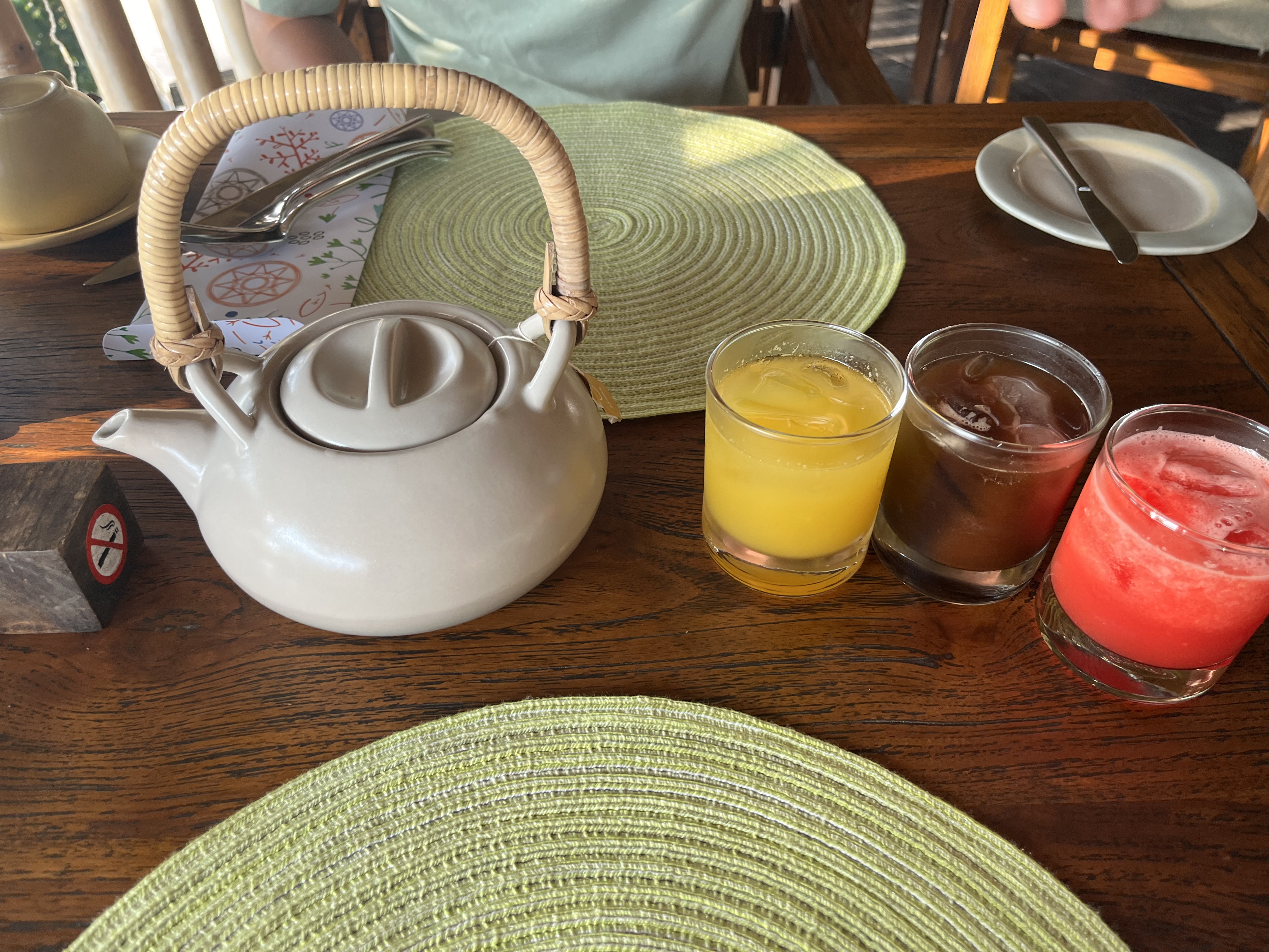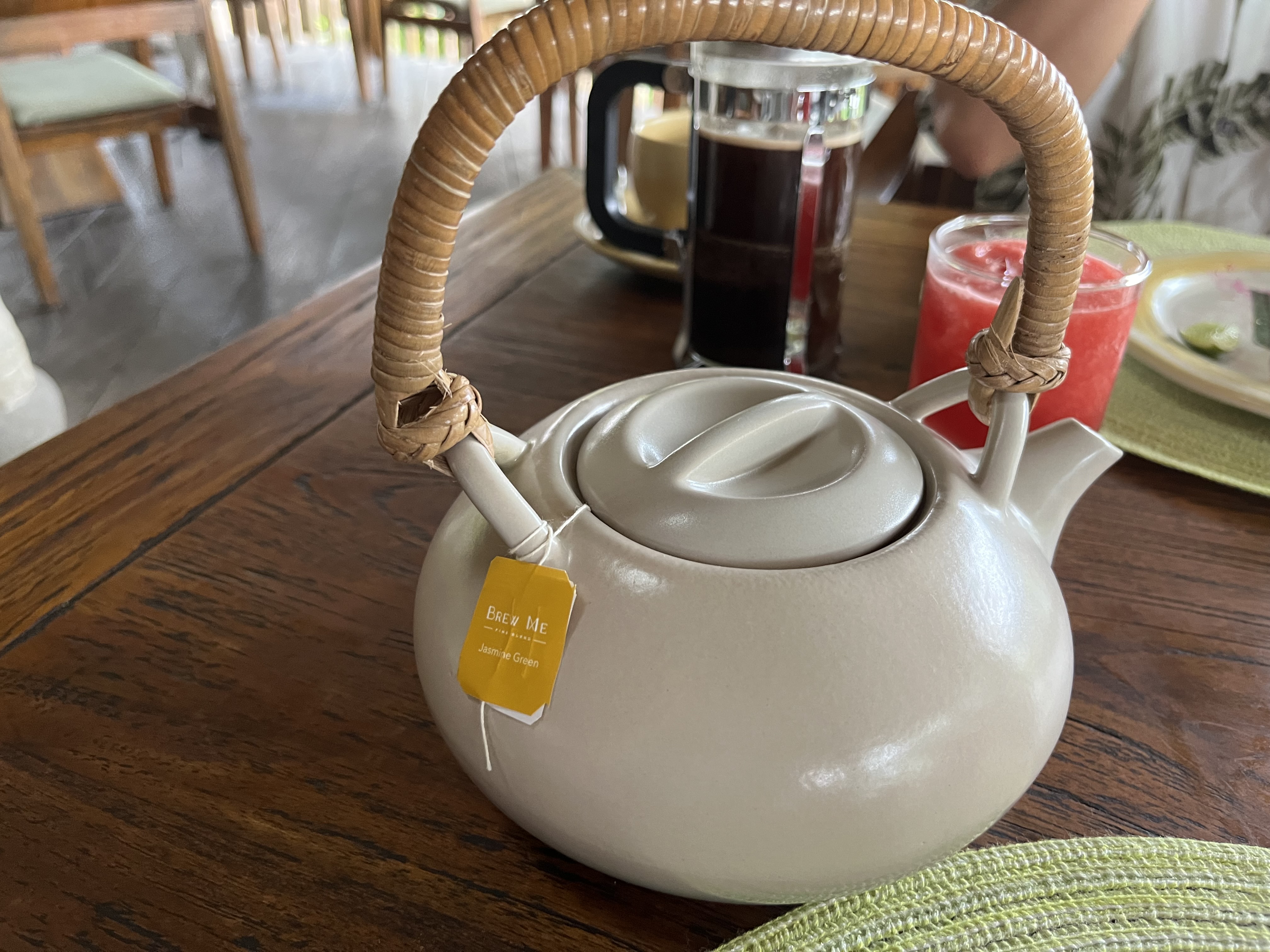 차랑 주스를 가져다 주시는데 솔직하게 잔 크기 보고 더 먹고 싶다고 생각했는데 무맛이어서 하..다행이다 싶었어요.ㅋㅋ 그리고 자스민티가 예상외로 너무 맛있어서 아침잠을 깨며 너무 행복했었고, 찻주전자가 예뻐서 하나 기념품으로 사가고 싶을 정도였어요. 바로 리조트 내 기념품샵가서 같은 찻주전자 세트가 있는지 봤지만 아쉽게도 없더라구요.