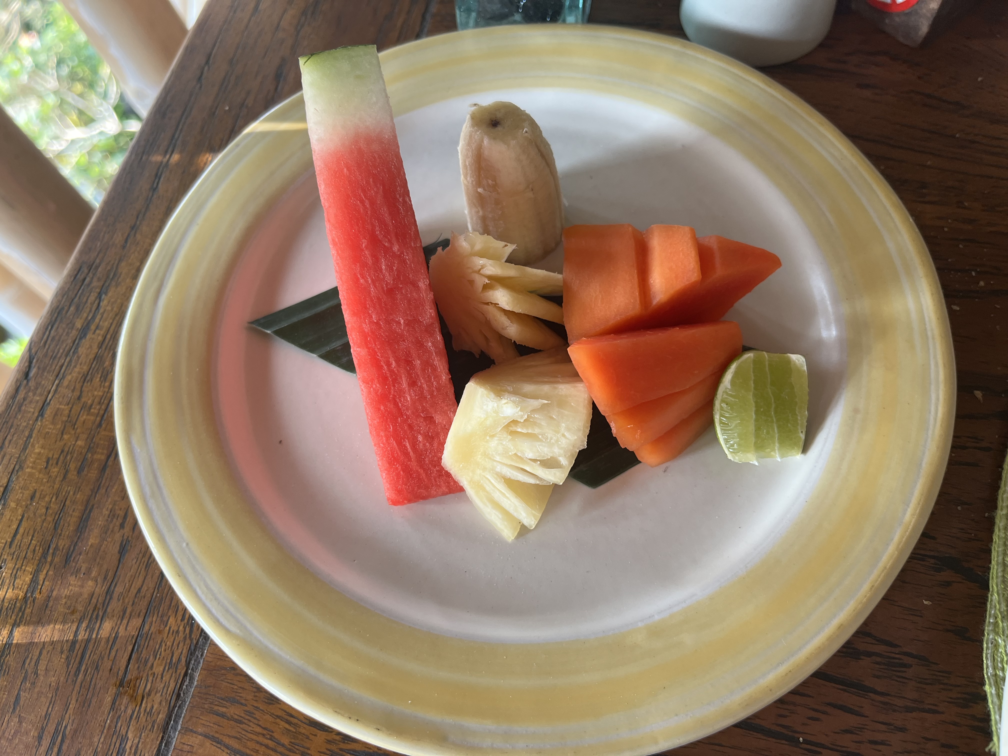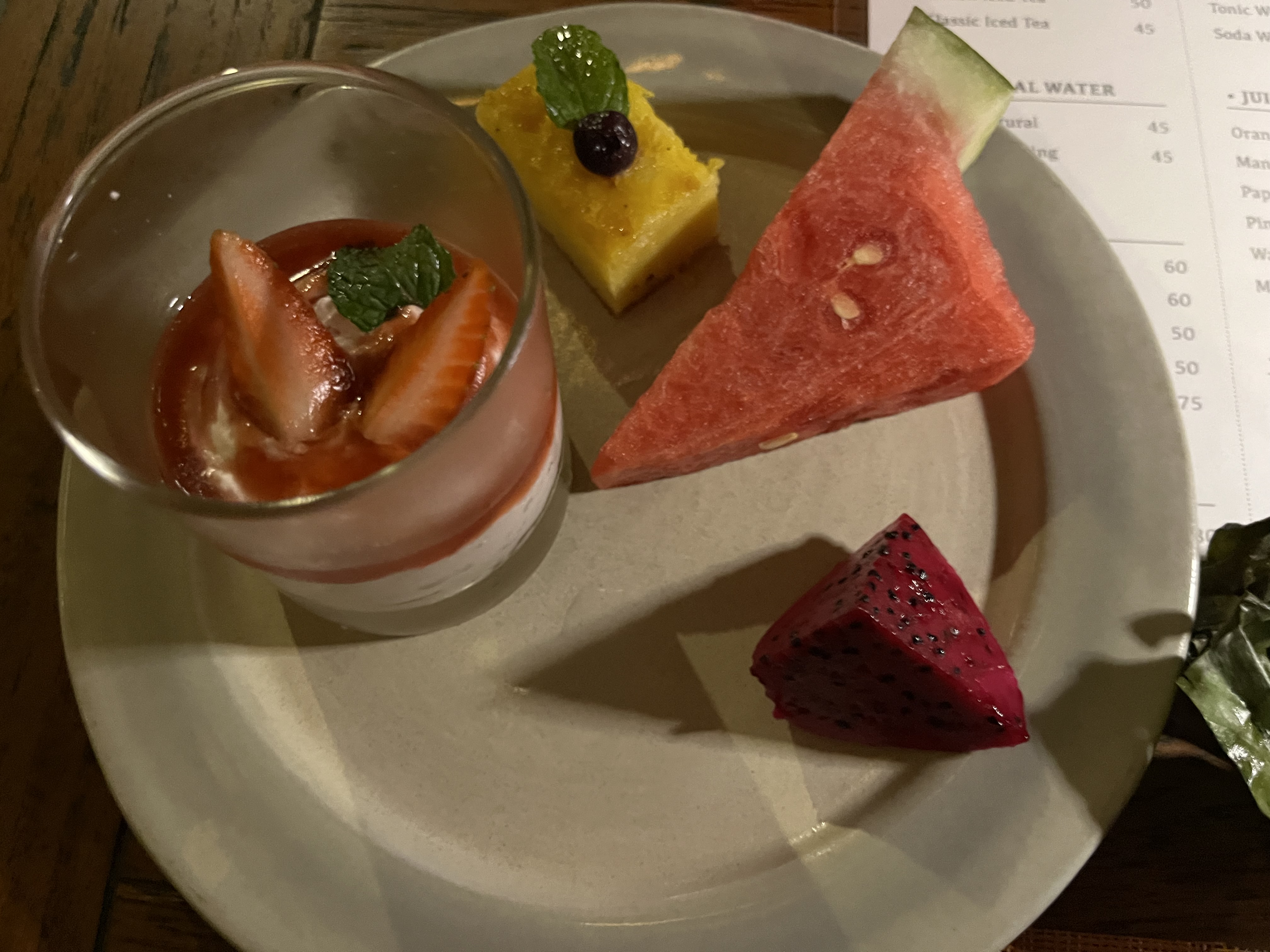 스타터로 나온 과일이었는데 저는 후식으로 먹는게 좋아서 마지막에 먹었어요. 수박은 괜찮았는데, 파인애플은 많이 시큼해서 혀가 조금 아팠었네요. 파파야랑 용과도 무난했는데, 있으면 먹는 과일이지 너무 좋아하는 편은 아니어서 구성이 아쉬웠어요. 그리고 생각보다 발리 과일이 다른 동남아에 비해 맛이 없다고 느껴져서 만족스럽지 않았던 것도 있었어요. 열대 과일 먹으려고 여행하는 과일 러버로써 이 점이 너무 아쉬웠어서 기억에 진하게 남아있네요..🥲 (첫날은 용과가 다음날은 용과대신 바나나로 구성이 조금 바뀌어서 나왔는데 큰 차이는 없었어요.)