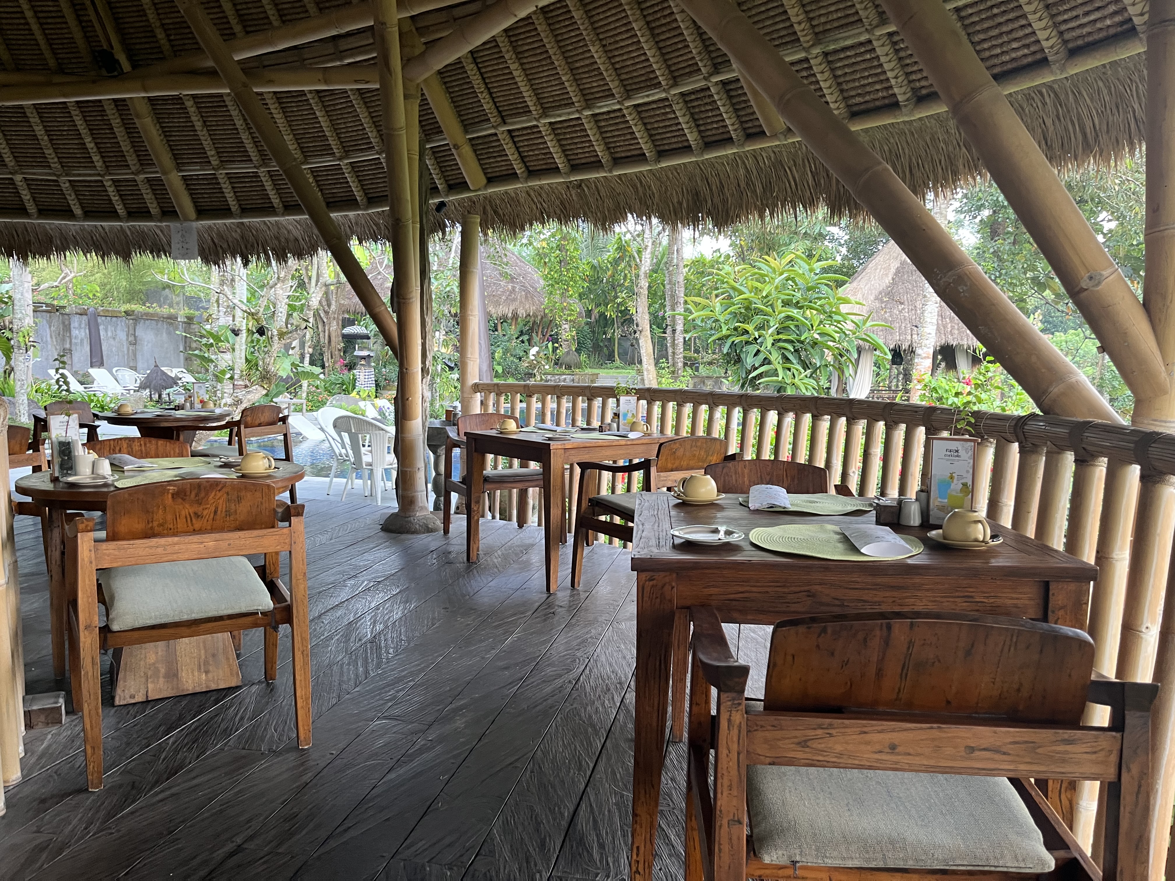 계단을 내려가도 식당인데 수리 중이어서 저는 위층의 식당만 이용 가능했어요. 다만, 나무가 울창해서 햇빛이 잘드는 느낌은 아니었고, 조명도 은은한 편이어서 밝지는 않았어요. 백색조명에 익숙한 저는 조오금 답답했는데, 발리만의 분위기인 것 같아요. 그리고 리조트 전반적으로 햇빛이 나무나 시설물에 가려져 있어서 그늘이 많아요. 탁트였지만 탁트인 것은 아닌거 같은 그런 좀 오묘한 느낌이 있어요.