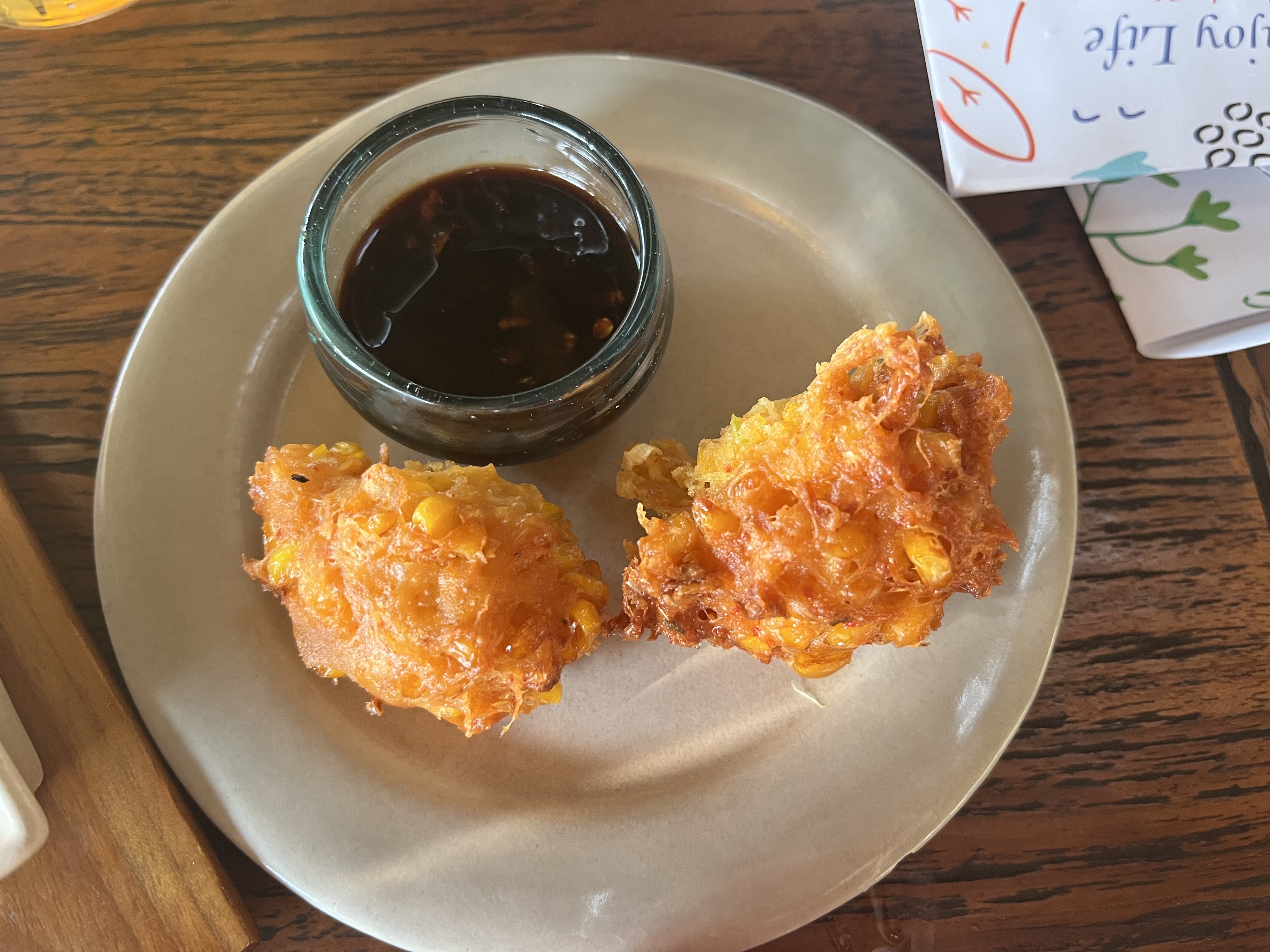 인도네시안식을 고르면 사이드 디쉬를 고르는데 저는 2일내내 corn fritters만 먹었어요. 옥수수가 들어간 채소튀김, 어묵 그 중간 정도의 맛이었어요. 다른 사이드에 비해 거부감도 덜하고, 맛있어서 먹었어요.