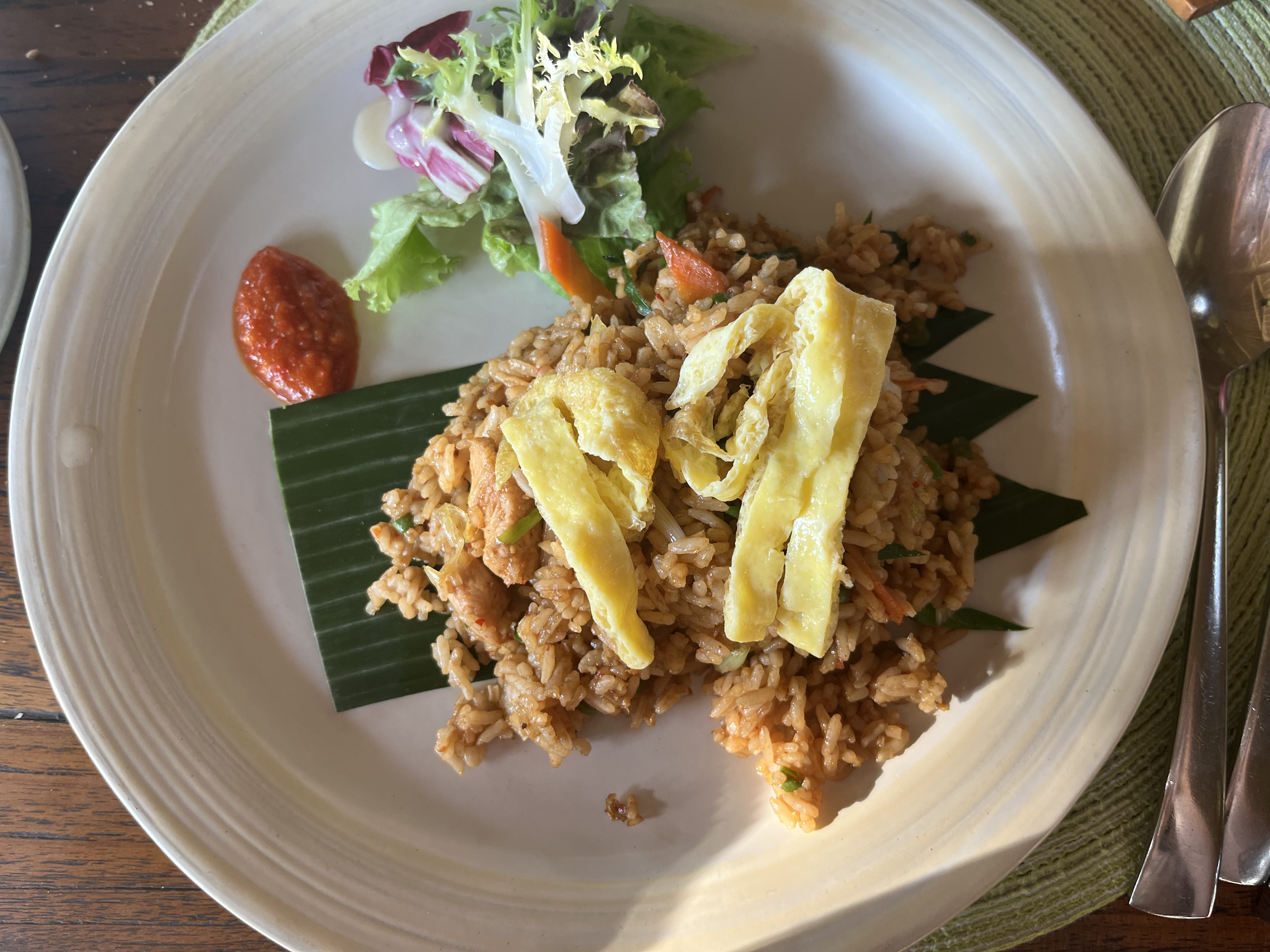 저는 주변에서 유명한 한식파여서 발리 여행내내 조식으로 나시고랭만 주구장창 먹었어요. 묵었던 다른 숙소보다 간과 풍미가 더 훌륭해서 진짜 맛있게 먹었어요. 글쓰는 지금도 나시고랭 또 먹고 싶네요.😱 볶음밥이라서인지 김치가 무진장 댕기는데 매콤한 삼발소스가 곁들여 나와 느끼함을 좀 해소해 줘서 거의 삼발소스에 나시고랭 비벼먹듯 먹었어요...ㅎㅎ
