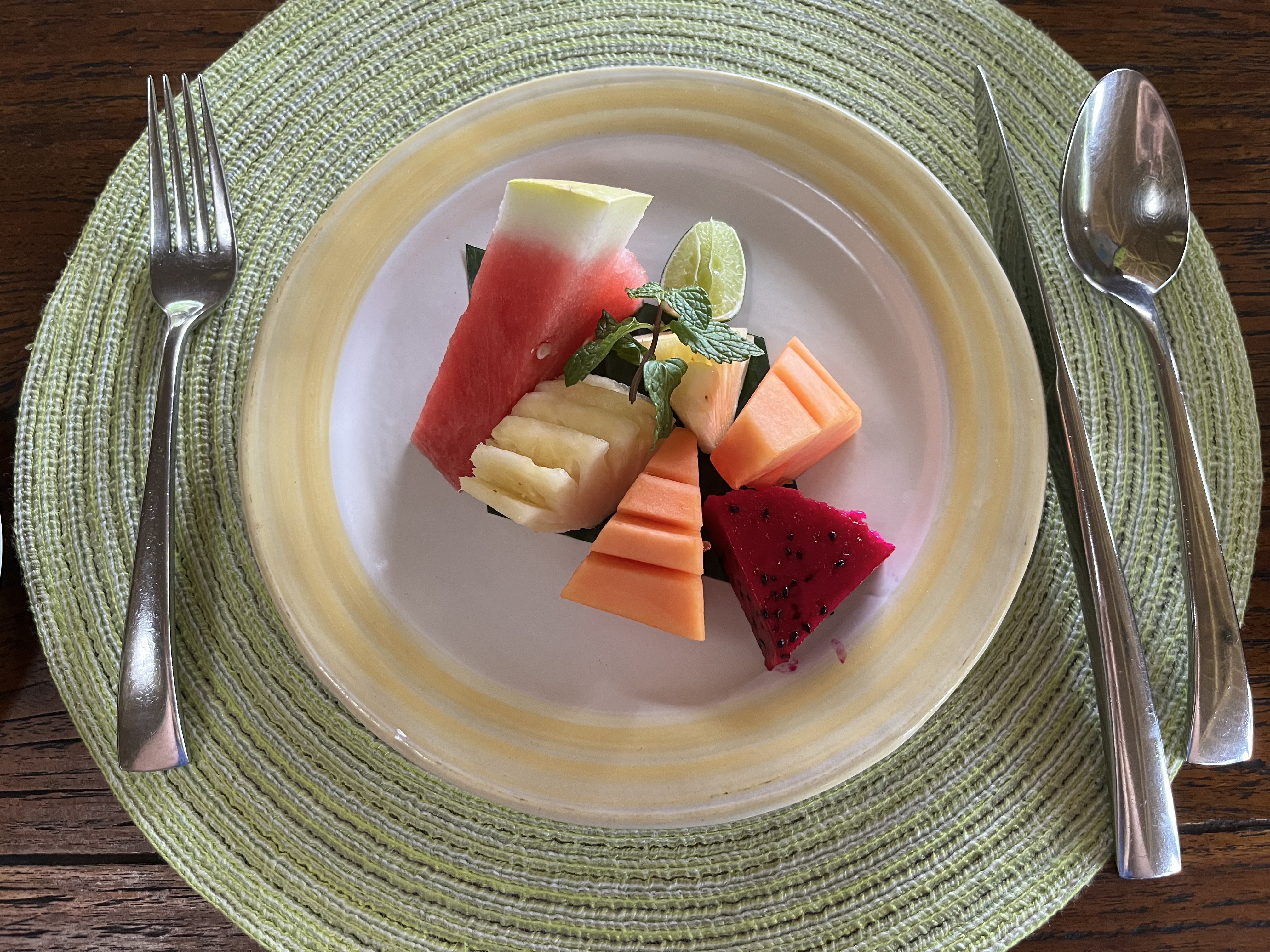 스타터로 나온 과일이었는데 저는 후식으로 먹는게 좋아서 마지막에 먹었어요. 수박은 괜찮았는데, 파인애플은 많이 시큼해서 혀가 조금 아팠었네요. 파파야랑 용과도 무난했는데, 있으면 먹는 과일이지 너무 좋아하는 편은 아니어서 구성이 아쉬웠어요. 그리고 생각보다 발리 과일이 다른 동남아에 비해 맛이 없다고 느껴져서 만족스럽지 않았던 것도 있었어요. 열대 과일 먹으려고 여행하는 과일 러버로써 이 점이 너무 아쉬웠어서 기억에 진하게 남아있네요..🥲 (첫날은 용과가 다음날은 용과대신 바나나로 구성이 조금 바뀌어서 나왔는데 큰 차이는 없었어요.)