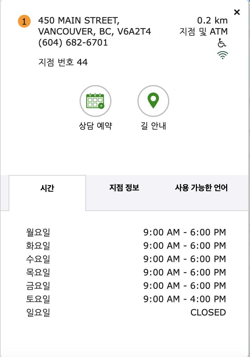입력한 우편번호를 기반으로 TD 지점들을 찾아준다. 이 중에 한국어를 지원하는 지점이 한인텔러가 있는 지점이다. 당시 머물던 임시숙소 근처 차이나타운지점에 한인텔러분이 계셔서 그 지점으로 예약하고 다녀왔다.