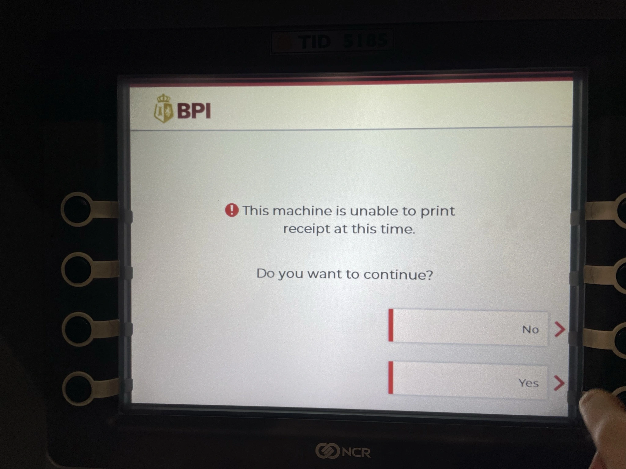 번역하면, 현재 시간에는 영수증이 발급되지 않는다고 합니다. 저희는 출금을 원하니 YES를 눌러주시면 됩니다.