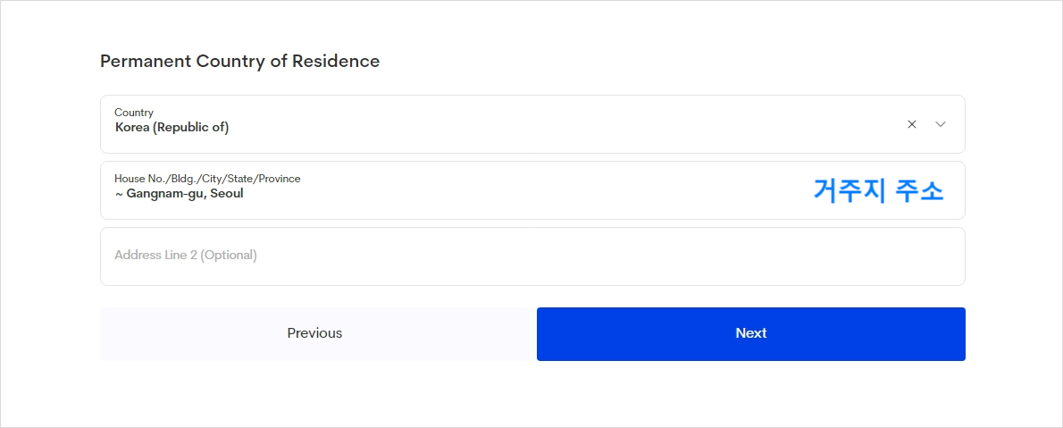 한국에서 현재 거주 중인 주소를 기재해 주시면 됩니다. 영문으로 작성이 어려우신 경우 아래에서 검색하여 작성해 주세요.