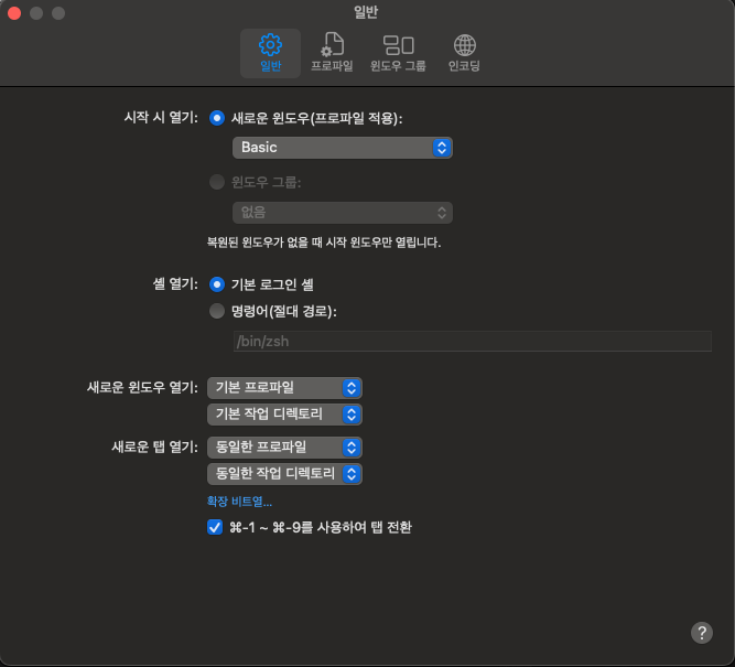 7. 이제 프로세스가 완료 됐을 때 터미널 창을 자동으로 종료해 보겠습니다 :) 터미널 창을 한번 클릭하시고 command + , 를 입력하시면 설정 창이 보이실 거예요! (혹은 터미널 창 클릭 후 터미널 -> 설정을 클릭하셔도 됩니다.)