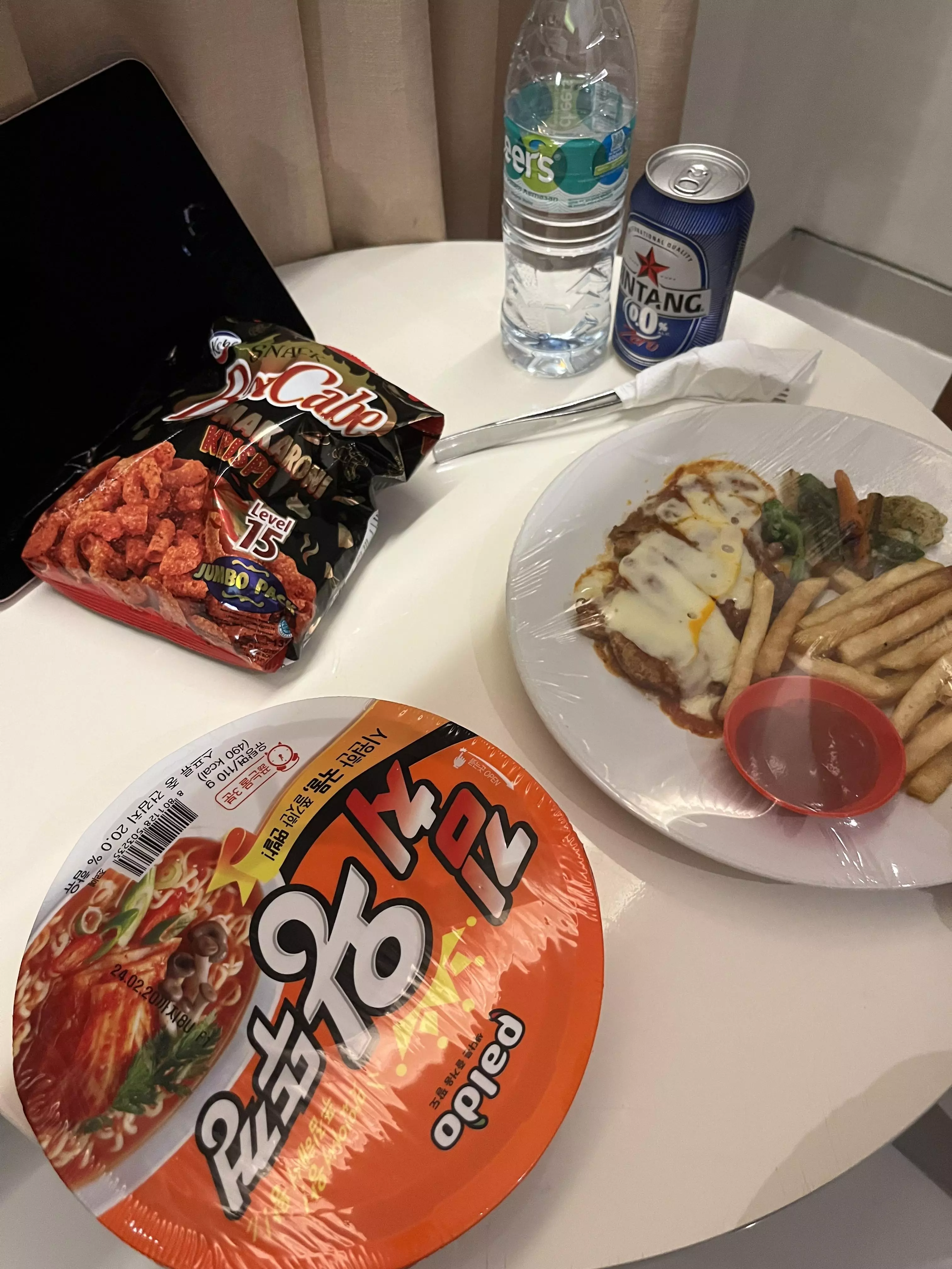 호텔 근처에서 간단하게 저녁을 먹었는데 완전 현지 식당이어서 사실 입맛에 맞지는 않았었어요. 아쉬운 마음에 룸서비스 메뉴를 하나 시켜 따뜻한 컵라면과 곁들여 먹었어요. 주문하면 방으로 가져다주는데 수령 즉시 결제를 요청했어서 카드로 결제했어요! 메뉴를 분명 찍어뒀던 것 같은데 사진이 사라져서 메뉴 이름과 가격을 다 잊었지 뭐예요...🥲🥲