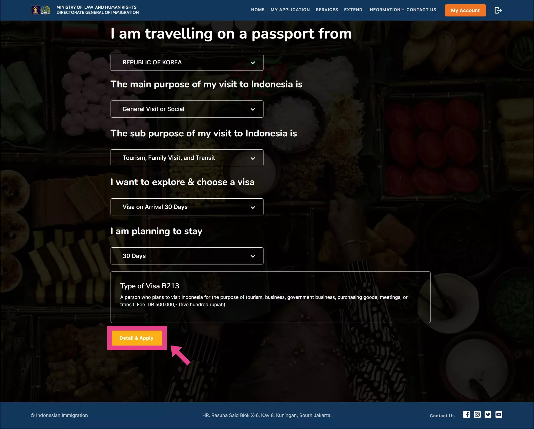 다음으로는 비자 타입을 고르는 것인데요. 두 번째의 30일 비자로 선택하시면 B213 타입의 비자가 안내되며 IDR 500,000의 수수료가 발생됩니다.