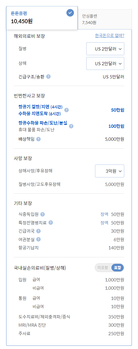 입력한 정보에 맞는 보험료가 안내되는데요. 다른 보험도 일부 가능하겠지만 저는 해외의료비 및 사망 보장 범위를 원하는 범위로 설정할 수 있어서 좋았구요. 국내실손의료비도 포함할지 여부를 선택할 수 있어서 저는 좋았어요. 가입 전에 ?기호 위에 마우스를 올리시면 보장범위에 대한 정보도 손쉽게 확인이 가능하답니다!